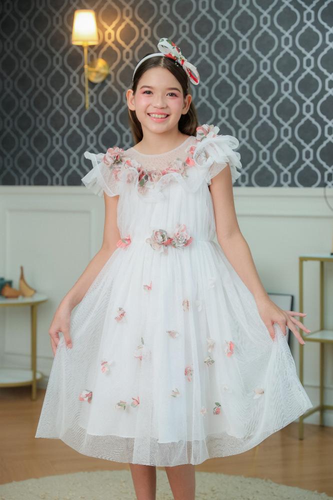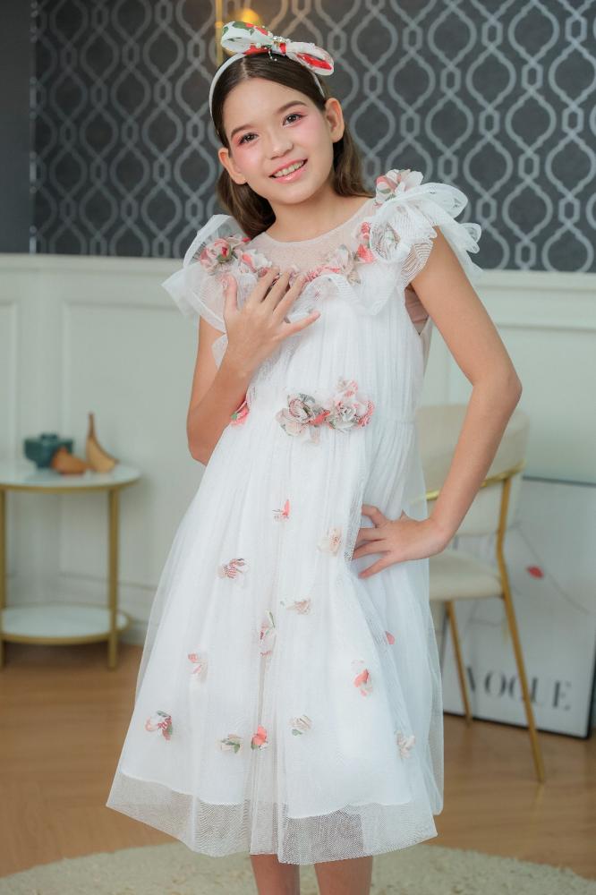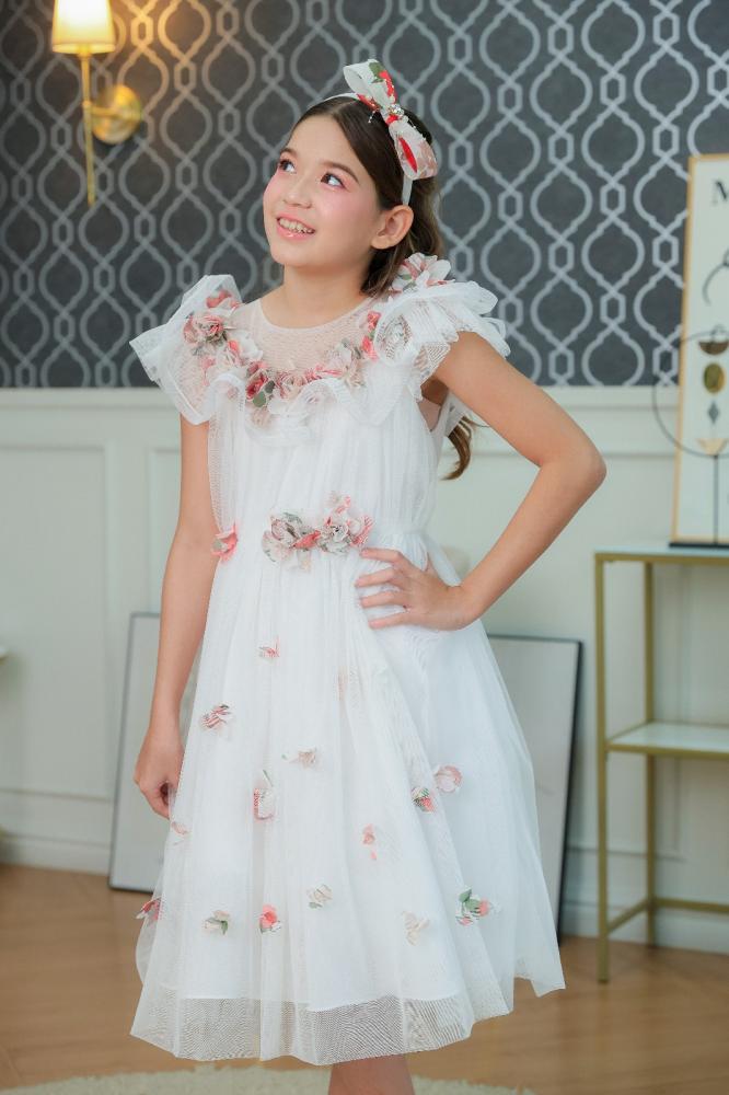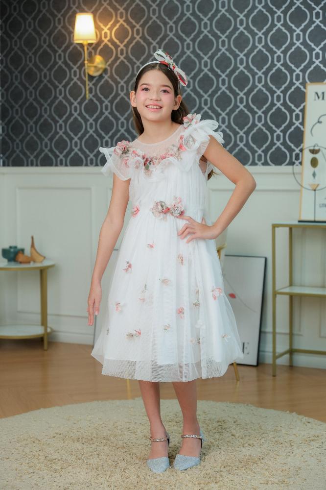 يتميز هذا الفستان الساحر بتصميم أنيق وفخم يجمع بين الفخامة والراحة. يتميز الفستان بطبقات متعددة من قماش التول والدانتيل الأبيض الناعم، مع تفاصيل زخرفية زهرية ثلاثية الأبعاد تضفي عليه لمسة من الجمال والرقي. يحتوي الفستان على أكمام شفافة مميزة مزينة بالزهور، مما يعزز أناقته. يأتي الفستان مع حزام خصر مرصع بالزهور ليضفي مظهراً متناسقاً وجذاباً.