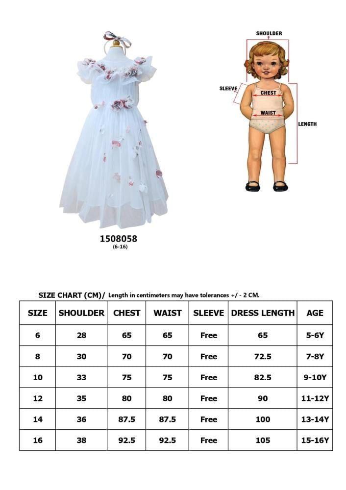 الأحجام المتاحة: يتوفر الفستان بمقاسات مختلفة تناسب الأعمار من 6 إلى 16 سنة. يرجى الرجوع إلى دليل المقاسات لاختيار الحجم المناسب بدقة.
