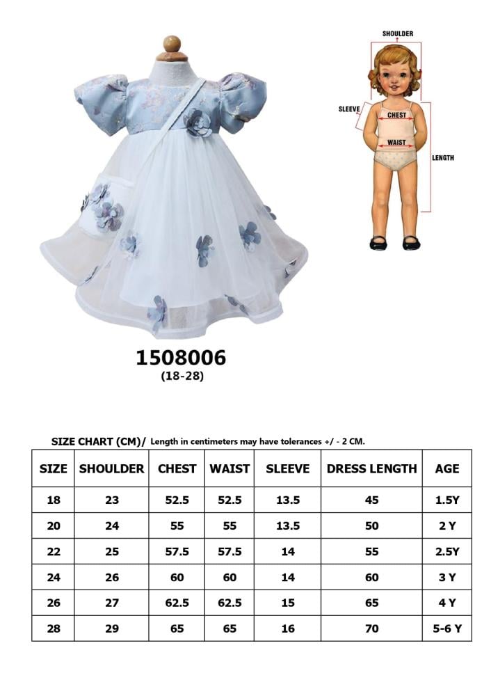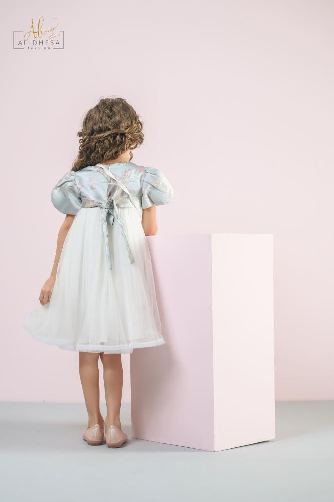- التصميم العلوي: يتميز الجزء العلوي من الفستان بتصميم فاخر ومزخرف بالكامل بتطريزات زهرية دقيقة تضفي لمسة من الأناقة والفخامة. الكتفان مزينان بتفاصيل جميلة تبرز جمال الطفلة.