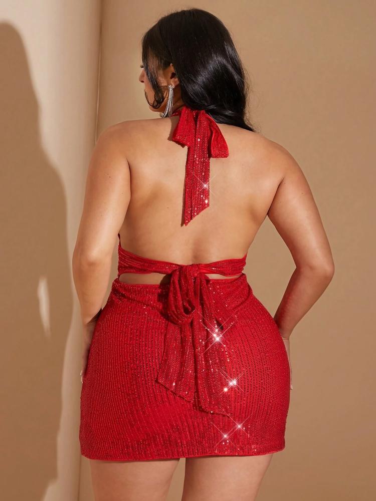 فستان سهرة أحمر لامع بتصميم رقبة عميقة وقصة قصيرة أنيقة